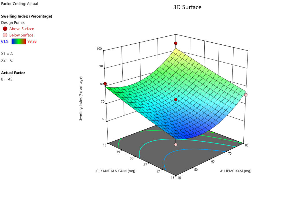 Fig. 7.1: Swelling index 3D surface plot of levofloxacin floating tablets (HPMC K4M vs Xanthan gum)