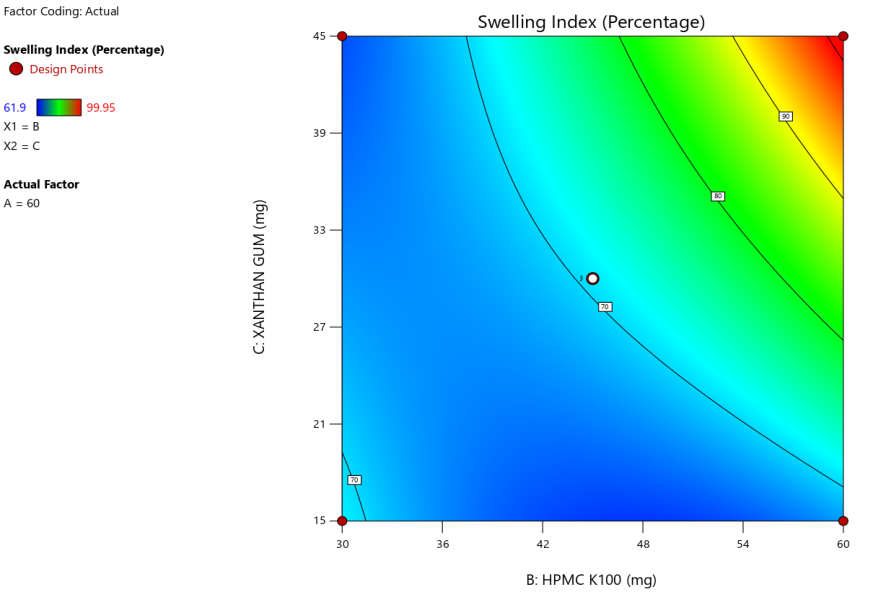 Fig. 8: Swelling index contour plot of levofloxacin floating tablets (HPMC K100M vs xanthan gum)