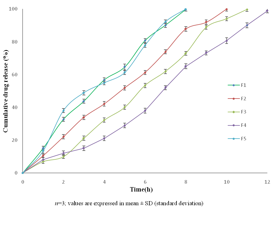 From the dissolution study, it was observed that with increasing polymer concentration, the time required to drug release 90% of the drug was increased. A greater degree of swelling results from the higher concentration of HPMC. As a result, the drug's diffusional path length is lengthened, which in turn decreases drug release. On the other hand, lowering the HPMC content lowers swelling and gel layer thickness. This permits more rapid medication release rates [15].