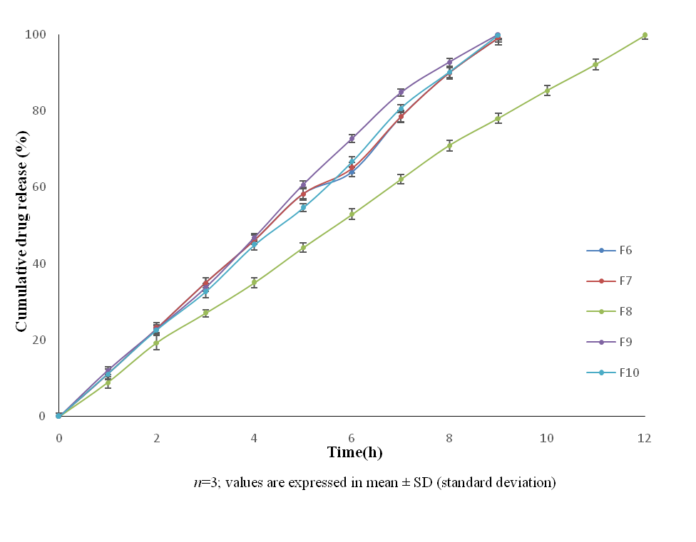 Fig. 9.1: In vitro drug release profile of levofloxacin floating tablets formulation (F6-F10)