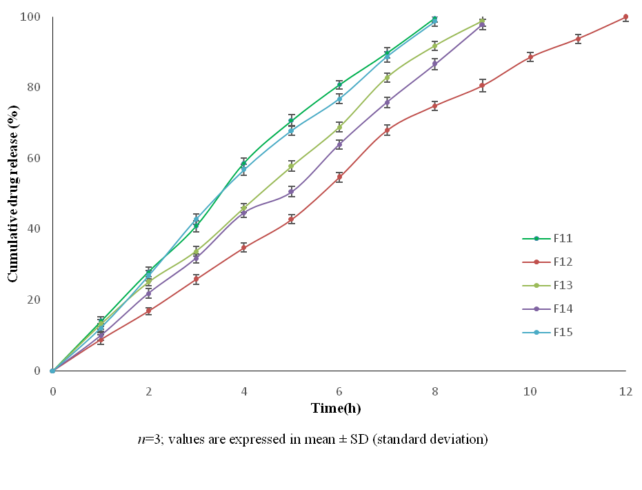 Fig. 9.2: In vitro drug release profile of levofloxacin floating tablets formulation (F11-F15)