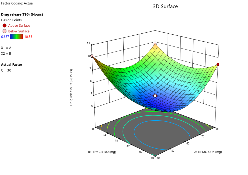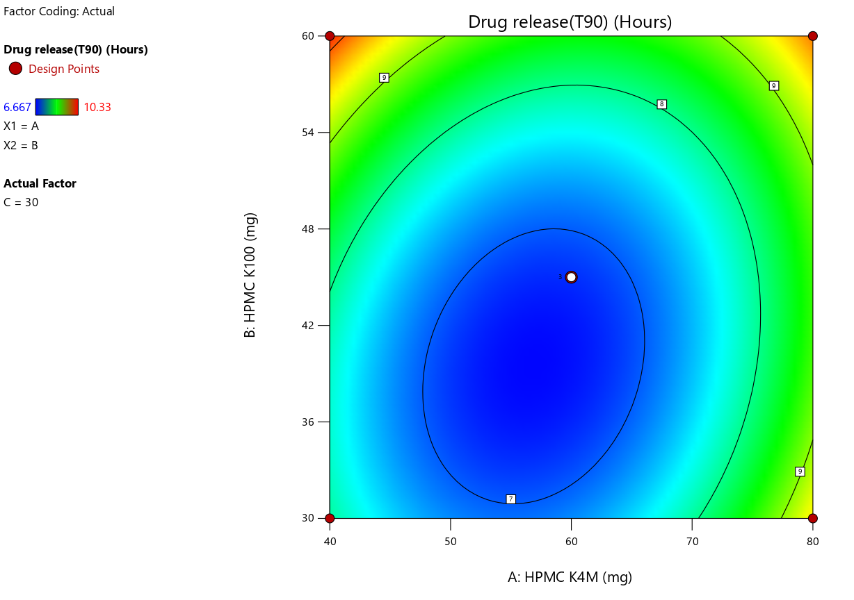 Fig. 10: T90% contour plot of levofloxacin release from the formulation (HPMC K4M vs HPMC K100M)