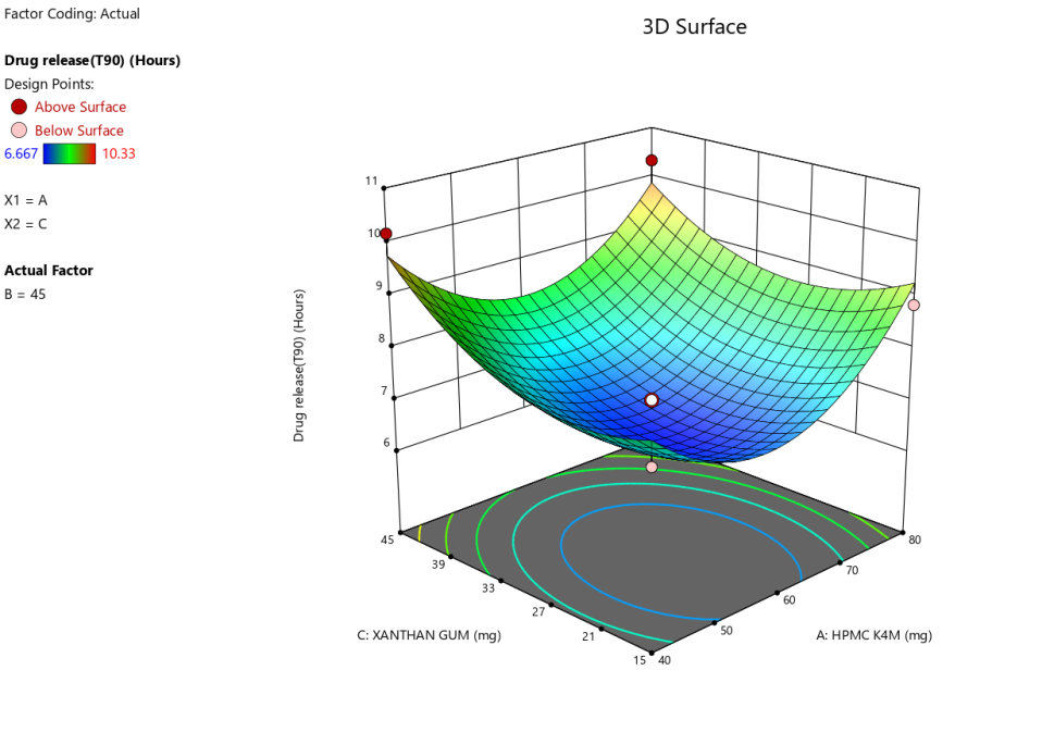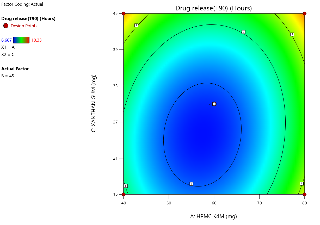 Fig. 11: T90% contour plot of levofloxacin release from the formulation (HPMC K4M vs Xanthan gum)