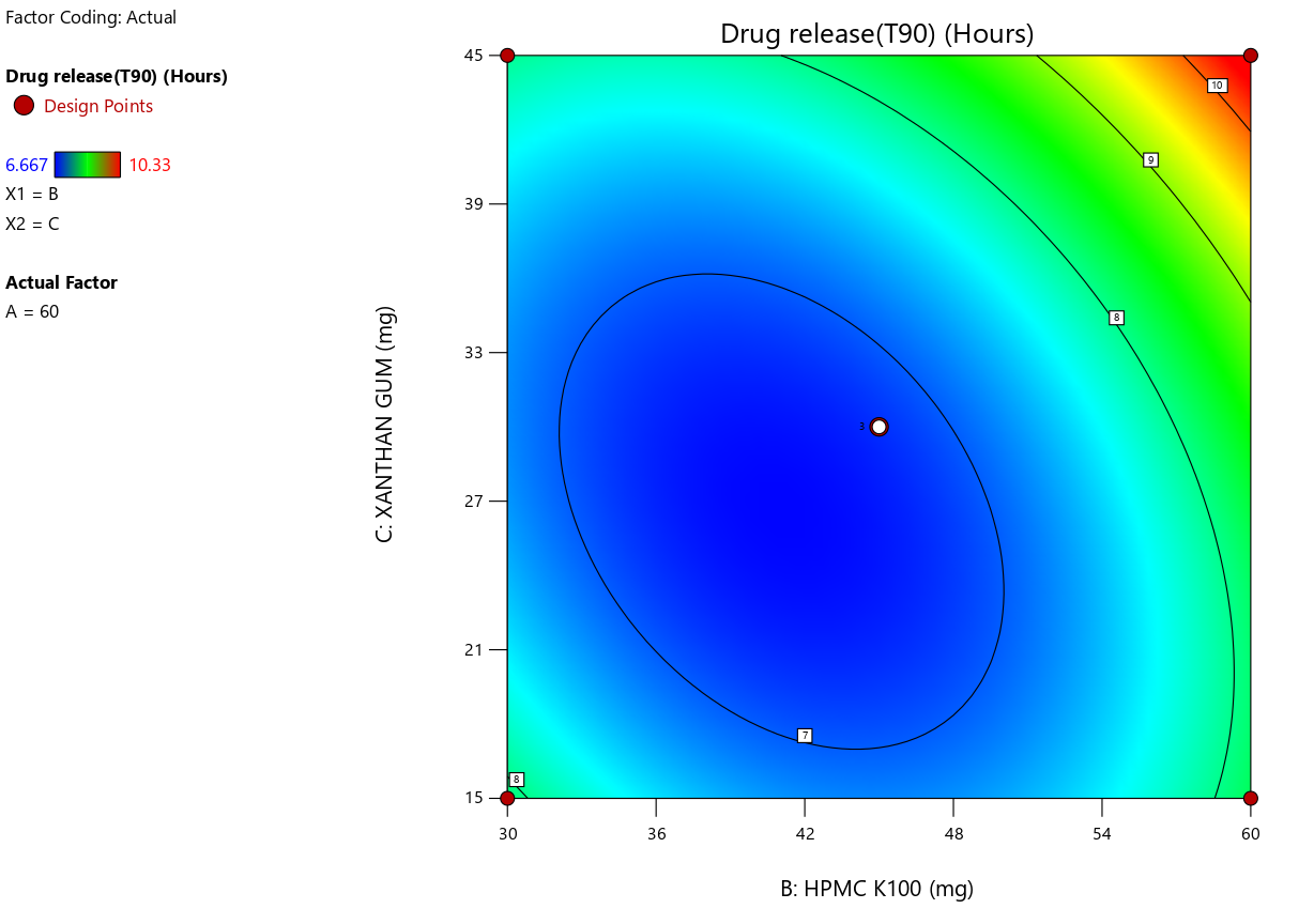 Fig. 12: T90% contour plot of levofloxacin release from the formulation (HPMC K100M vs Xanthan gum)