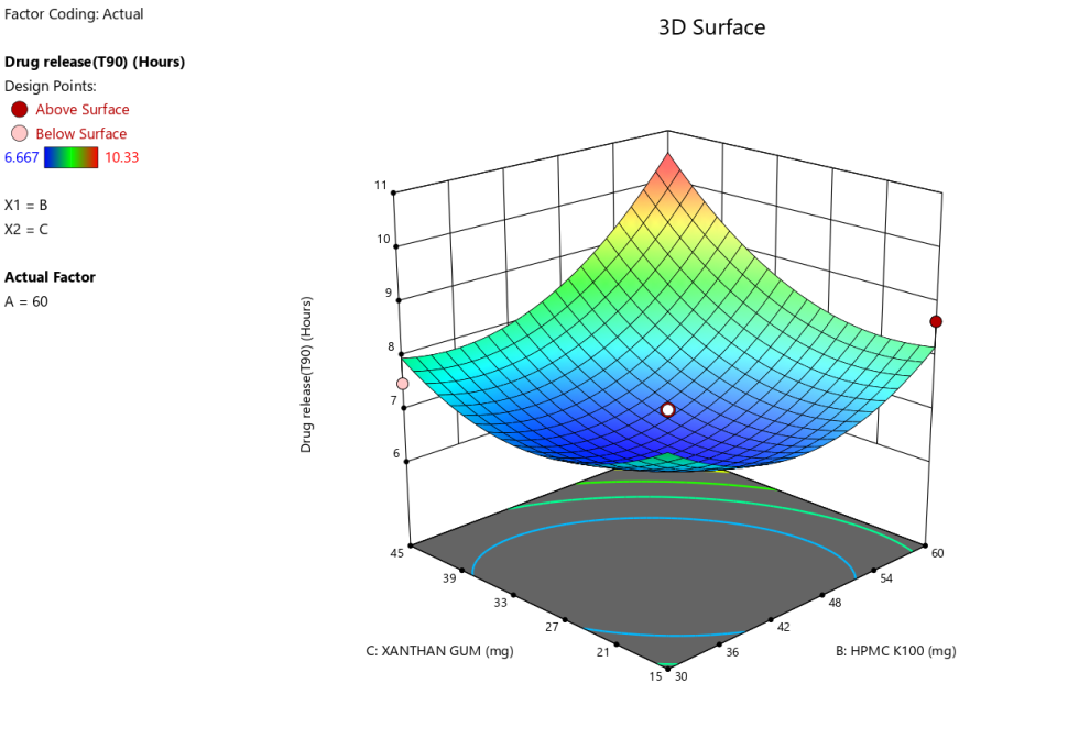 Fig. 11.1: T90% 3D surface plot of levofloxacin release from the formulation (HPMC K4M vs Xanthan gum)