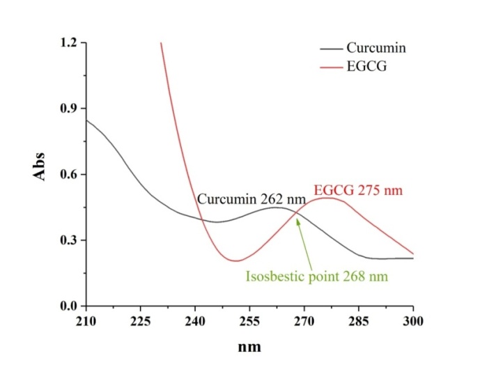 EGCG and curcumin were separately dissolved in methanol, and both solutions were scanned in a UV-Visible spectrophotometer in the 200-400 nm range. EGCG shows absorption maxima at 275 nm, whereas curcumin at 262 nm. Both spectra cross at 268 nm, which was the isosbestic wavelength. So, 268 nm was considered for UV detection. The overlay UV spectrum of curcumin and EGCG is shown in fig. 3.
