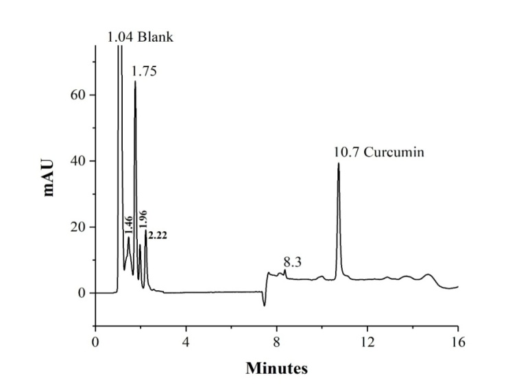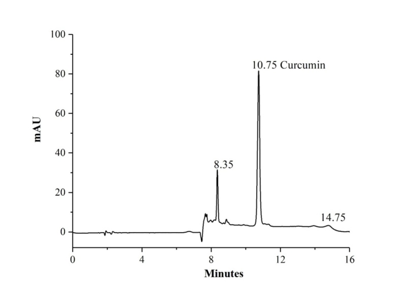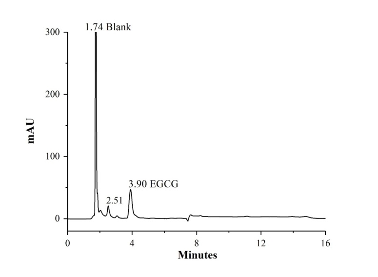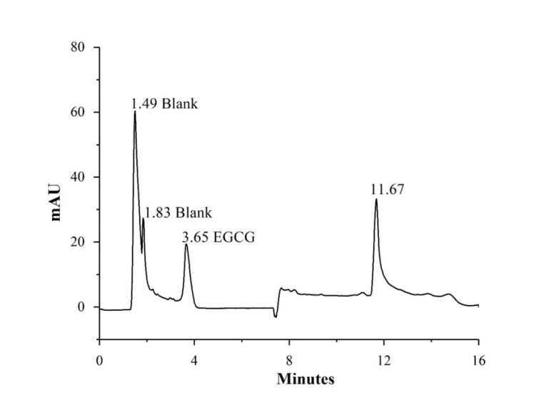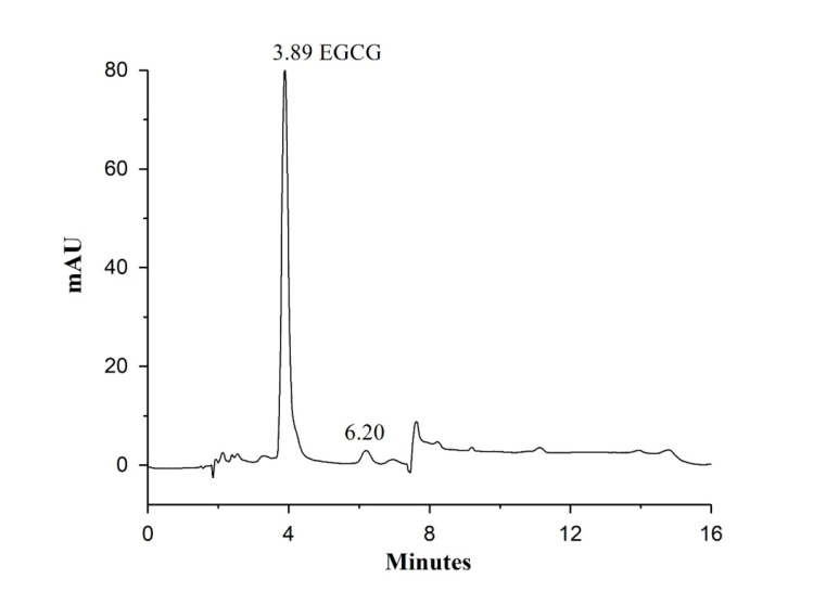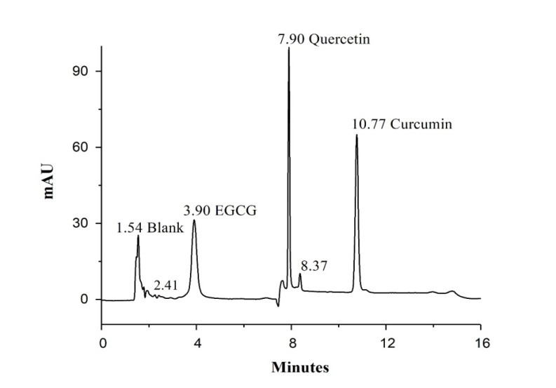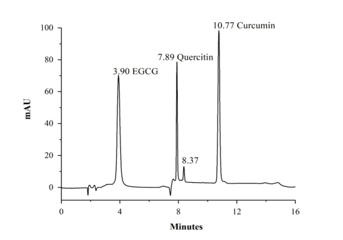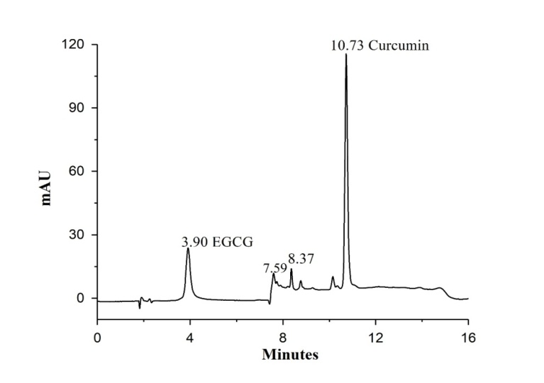 EGCG and curcumin peaks were found at a retention time of 3.9 min and 10.7 min, and the internal standard quercetin peak was found at 7.8 min. The absence of overlapping peaks in the nanoparticle sample demonstrates the specificity of the method. Furthermore, after various stress degradation studies, the peaks of EGCG and curcumin were clearly distinguished from the degradation products [28].