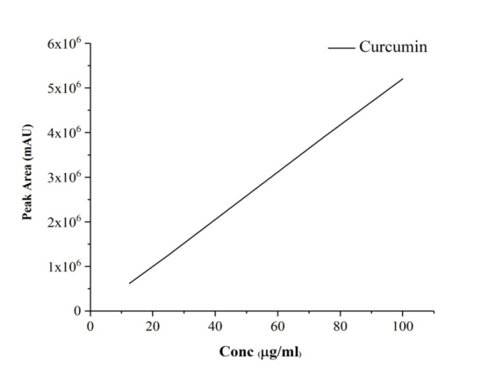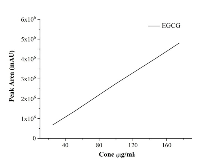 Linearity studies were developed from a standard stock solution of curcumin (500 µg/ml) and EGCG (500 µg/ml). 12.5, 25, 50, 75, and 100 µg/ml concentrations of curcumin, and 25, 50, 100, 150, and 175 µg/ml concentrations of EGCG were prepared from standard stock solutions for linearity. Peak area as the Y-axis was plotted against linearity concentration as the X-axis to create the calibration curve.