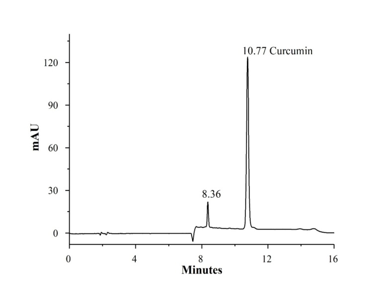 One mixed standard solution of EGCG (100 µg/ml) and curcumin (50 µg/ml) was prepared and injected (20 µg/ml) into the HPLC system under refined chromatographic method parameters. The resolution, tailing factor, the number of theoretical plates, retention time, and other system suitability parameters were considered [29].