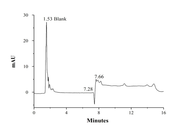 The LQC, MQC, and HQC values after extraction from plasma were 91.23 %, 90.89 %, 91.76 % for EGCG, and the extraction values from plasma were 90.56 %, 91.81 %, 92.7 % for curcumin. This result indicates that the proposed HPLC method may be used for various in vivo pharmacokinetic studies [28]. The chromatogram of blank plasma and mixed standard spiked with internal standard and rat plasma are given in table 10 and fig. 24 and 25, respectively.