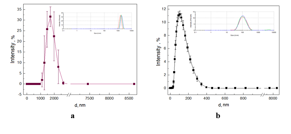The study of alcohol and water dilutions showed that the latter had greater stability. Water dilutions had electro kinetic potentials higher than the limiting values of the stability of the colloidal system (25 mV) [10, 16] and reached-34 mV. It was reasonable to assume that stable nanoparticles in aqueous dilutions would freely penetrate cells (for example, due to pinocytosis) and transport biologically active substances. The size spectra of these particles have a maximum at about 150 nm (fig. 2). Alcoholic solutions differed in the presence of significantly larger micrometer-sized particles at the same dilutions.