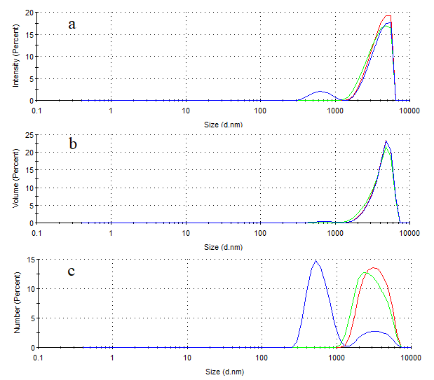 Fig. 3: Size distribution of light scattering intensity (a), volume (b) and number of particles (c) of the dispersed phase of alcohol dilutions (1:20) of reference tinctures