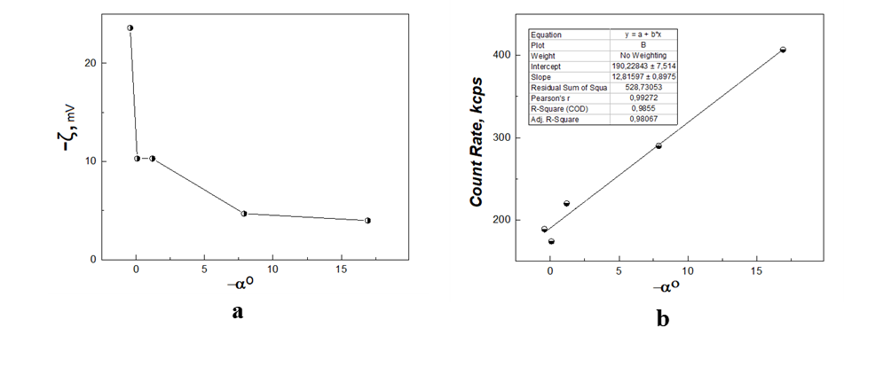 Fig. 4: Correlation of optical activity α° with ξ-potential (a) and number of photon pulses (b) for hawthorn tincture