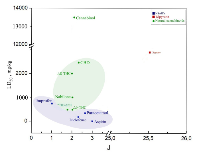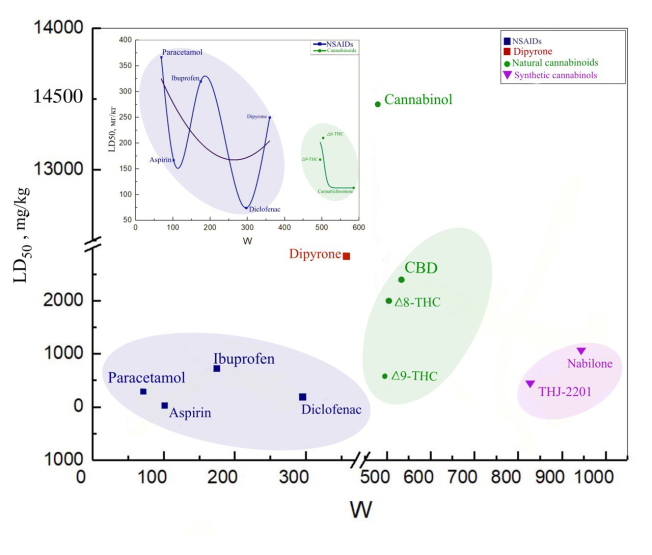 Thus, plant and synthetic cannabinoids show less toxicity than most NSAIDs considered. For synthetic cannabinoids–nabilone and THJ-2201–the Wiener index is approximately 2 times higher than for plant analogues. Cannabidiol and cannabinol, having close values of their topological indices and insignificant psychoactivity, have the highest LD50 values, i.e. they are the least toxic. For the Δ8-THC and Δ9-THC positional isomers–in terms of the position of the double bond–the differences in toxicity and topological indices are insignificant.