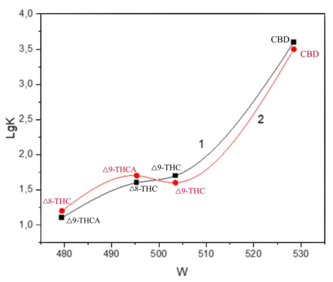 As can be seen from table 1, the decrease in the bond strength of plant cannabinoids to receptors, reflecting changes in the structure of the molecules, is quantified by an increasing Wiener index. An exception is the synthetic cannabinoid nabilone, which has a high affinity for receptors and the highest Wiener index in the presented group of compounds. The appearance of a carbonyl group in the structure of nabilone, a decrease in the aromaticity of its molecule, and the racemic form of the drug caused a violation of the pattern identified for the cannabinoids of plant origin.