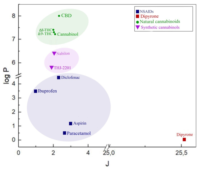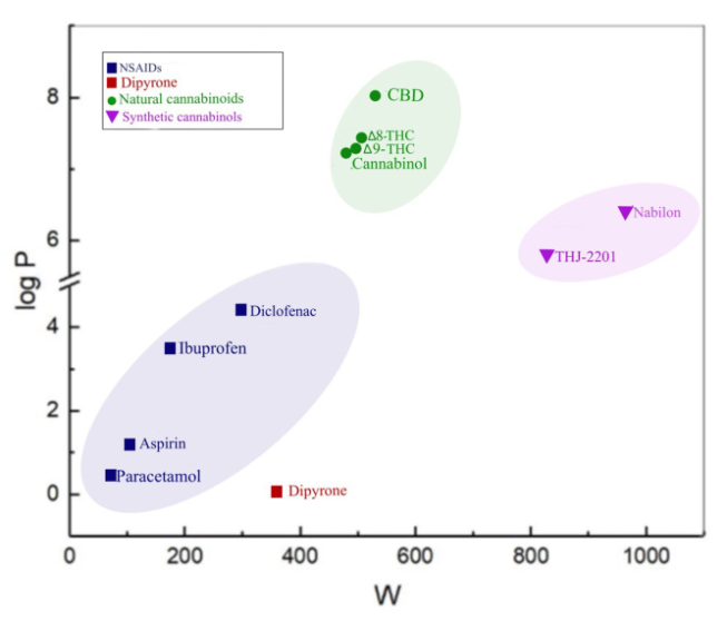 The goal of the work is to prove the benefits of biopharmaceutical parameters of cannabinoids over NSAIDs using quantitative structure and activity relationships.