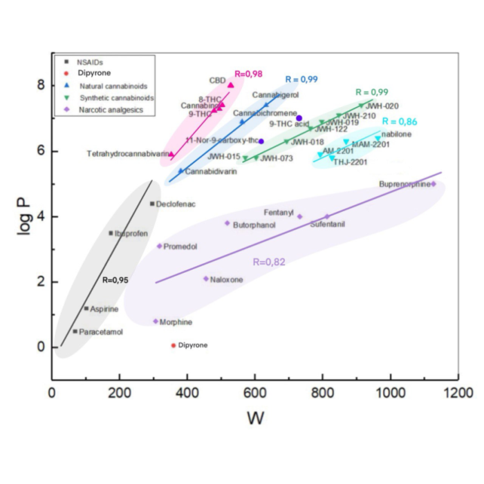 Extension of the group of cannabinoids (tetrahydrocannabivarin, cannabigerol, cannabichromene, 11-nor-9-carboxy-Δ9-tetrahydrocannabinol, cannabidivarin) with their synthetic analogues (JWH-015, JWH-018, JWH-019, JWH-020, JWH-022, JWH-122, JWH-210, AM-2201, MAM-2201) confirmed the conclusions about their higher lipophilicity compared to NSAIDs and opioid analgesics (fig. 6).