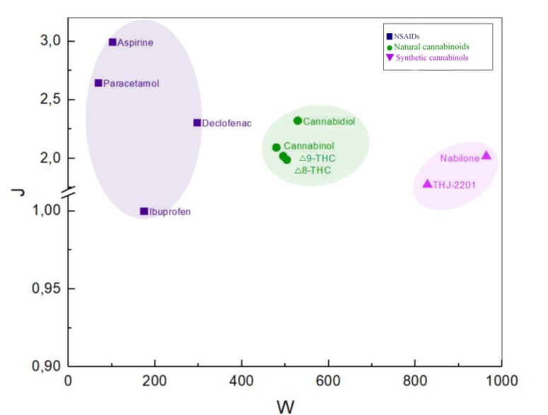 Results: It was shown that the calculated topological indices were in one-to-one correspondence with such biopharmaceutical parameters as the constants of equilibrium binding to cannabinoid receptors CB1 and CB2, toxicity, and lipophilicity. For example, it was shown that when the Wiener index changes from 480 to 530 LogK increases from 1.0 to 3.5. The LD50-W/J and logP-W/J diagrams demonstrate that cannabinoids are less toxic and more lipophilic than NSAIDs. Cannabidiol and cannabinol, having close values of their topological indices and insignificant psychoactivity, have the highest LD50 values, i.e. they are the least toxic. Moreover, for synthetic cannabinoids–nabilone and THJ-2201–the Wiener index is approximately 2 times higher than for plant analogues.