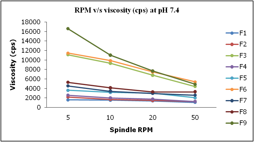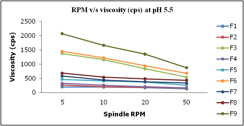 The viscosity of the prepared CTZ pH trigged in situ ocular gel was evaluated using Brookfield viscometer, spindle 62. For evaluation, the formulations were allowed to stand at room temperature (25 ᵒC) for 30 min. Viscosity was measured at rpm 5, 10, 20, and 50. An average of three readings at different positions were taken. The viscosity of the formulations was measured as such pH 5.5 and then at pH 7.4. pH of the formulations was changed from 5.5 to 7.4 using a 0.1M Sodium hydroxide solution [6-8].