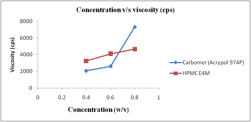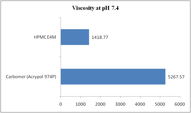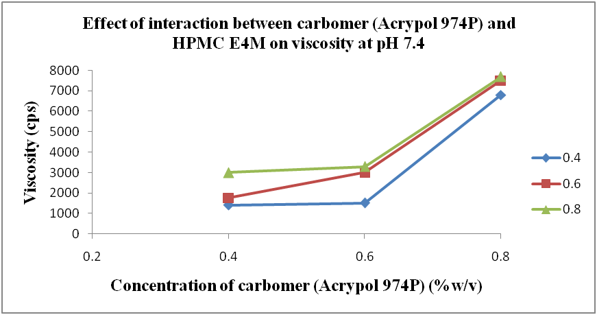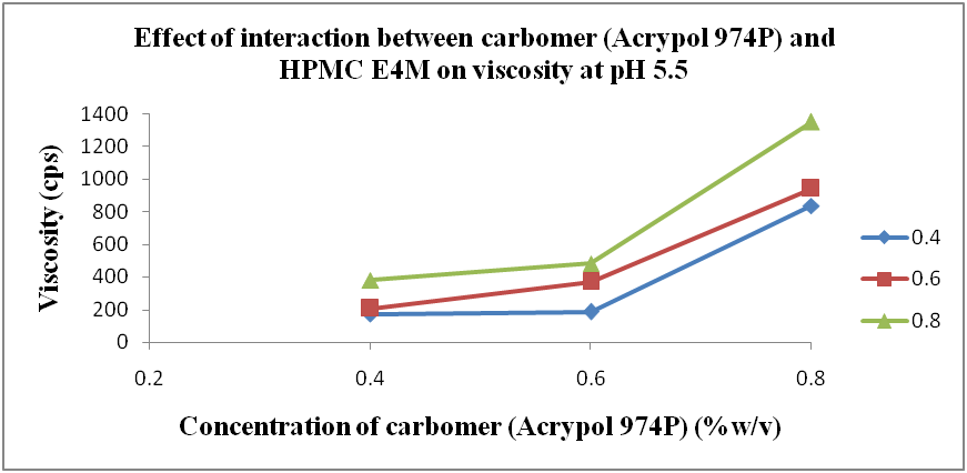 CTZ was successfully formulated in pH triggered in situ gelling system using Carbomer 974P in combination with HPMC E4M. It was seen that HPMC E4M is important for in situ gel behaviour along with Carbomer 974P on the basis of main effect of concentration of HPMC E4M and Carbomer 974P. In vitro results indicated that the in situ gel system is a viable alternative to conventional ocular drops by virtue of its ability to sustain drug release. The major pertinent findings of the present study is the increase in concentration of HPMC E4M from 0.4% to 0.8% resulted in insignificant (P = 0.64, df = 2, F = 0.73 and Fcrit = 5.143) increase in viscosity at pH 5.5. At pH 7.4, the increase in concentration of HPMC E4M from 0.4% to 0.8% also resulted in insignificant (P = 0.83, df = 2, F= 0.180 and Fcrit = 5.143) increase in viscosity and Increase in concentration of Carbomer (Acrypol 974P) from 0.4% to 0.8% resulted in significant (P = 0.004, df = 2, F = 15.25 and Fcrit = 5.143) increase in viscosity at pH 5.5. At pH 7.4, the increase in concentration from 0.4% to 0.8% also resulted in a significant (P = 0.0003, df = 2, F = 41.16 and Fcrit = 5.143) increase in viscosity.