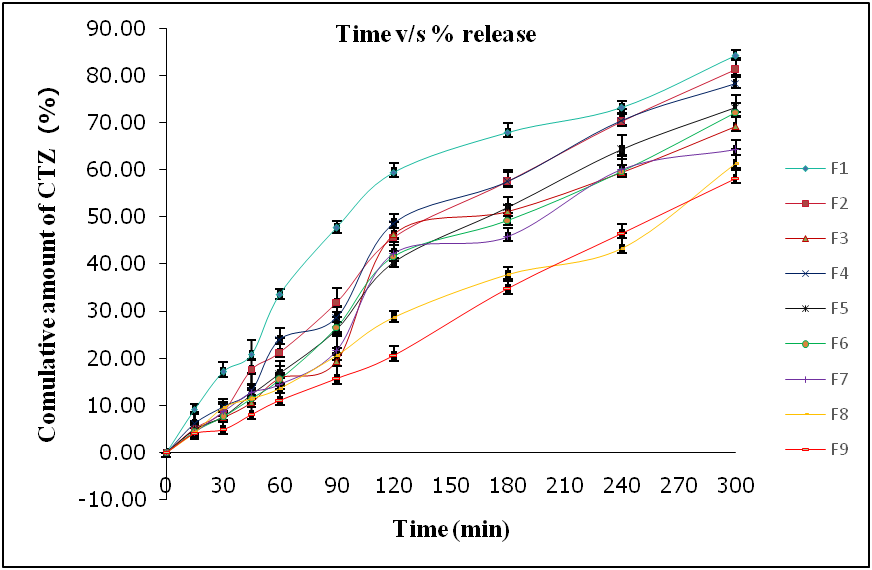 In vitro release studies were performed and results are presented in table 11 and fig. 10. After 300 min, the release from the formulations F1, F2, F3, F4, F5, F6, F7, F8 and F9 were found to be 84.21, 81.23, 69.22, 78.33, 73.21, 72.17, 64.23, 61.34 and 58.13 respectively. The release from the formulations can be arranged in the following decreasing order: F1>F2>F4>F5>F6>F3>F7>F8>F9.