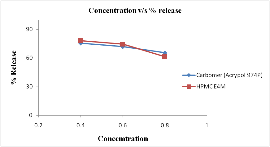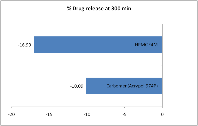 Release data were analyzed by ANOVA and it was found that the increase in concentration of Carbomer (Acrypol 974P) from 0.4% to 0.8% resulted in insignificant (P = 0.52, df = 2, F = 0.721 and Fcrit = 5.143) decrease in release at 300 min, while the increase in the concentration of HPMC E 4M from0.4% to 0.8% resulted in significant (P = 0.017, df = 2, F = 8.65 and Fcrit = 5.143) decrease in release at 300 min.