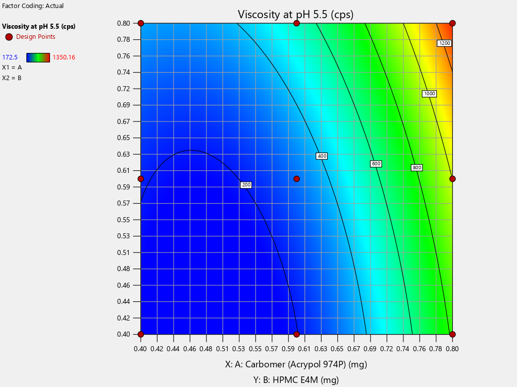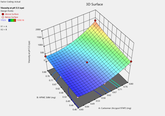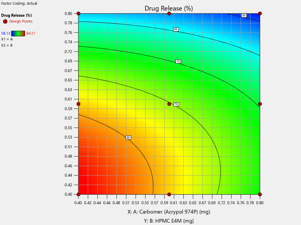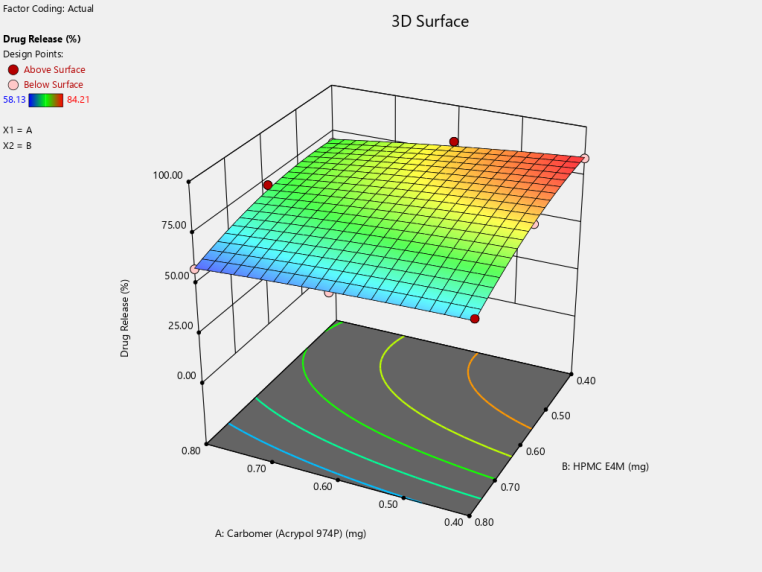 Based on the high values of R2, it can be concluded that a good fit was found for both responses. These polynomial equations can be used to draw conclusions after considering the magnitude of the coefficient and the sign (+or-) it carries. Amount of Carbomer (Acrypol 974P) (X1) and HPMC E4M (X2) are significant model terms which significantly affect viscosity and drug release.