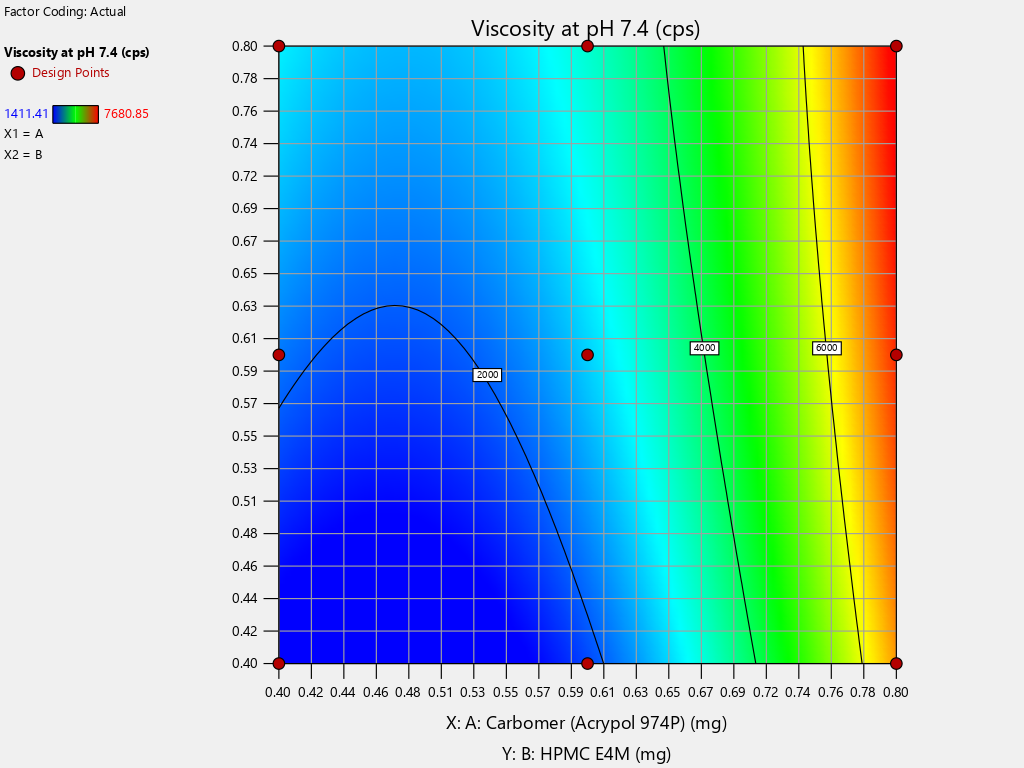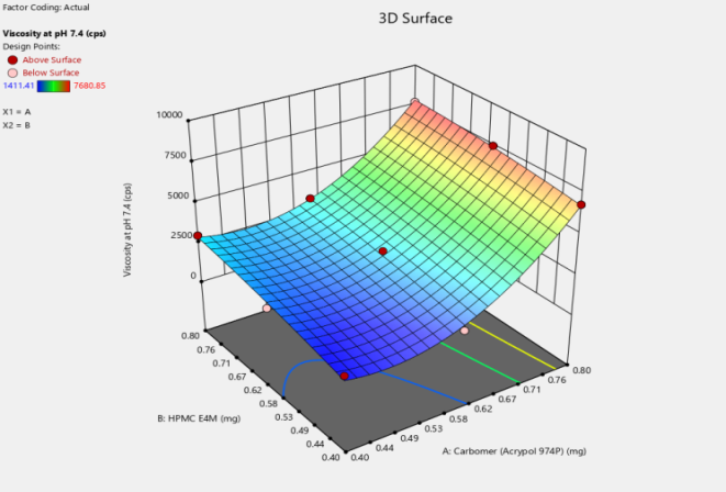 The response for viscosity at pH 5.5 and 7.4 was used to construct the 3-dimensional response surface as shown in fig. 14 and the form of 2 D contour plot in fig. 15.