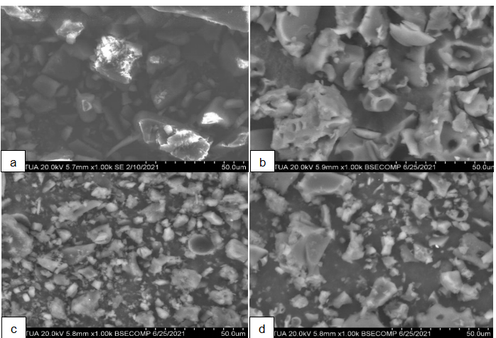 Fig. 1: Scanning electron microscopy analysis of (a) glibenclamide, (b) hydroxypropyl-β-cyclodextrin, (c) 1:1 mol inclusion complex (d) 1:2 mol inclusion complex