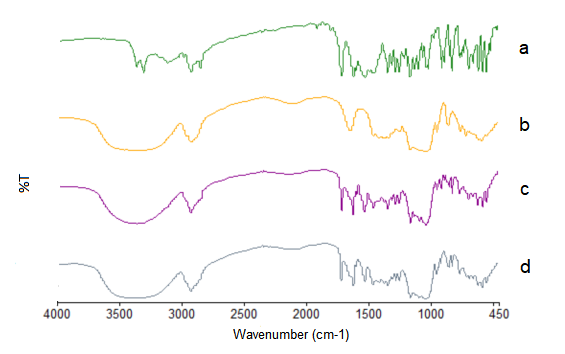Fig. 2: Fourier transform infrared spectroscopic analysis of (a) glibenclamide, (b) hydroxypropyl-β-cyclodextrin, (c) 1:1 mol inclusion complex (d) 1:2 mol inclusion complex