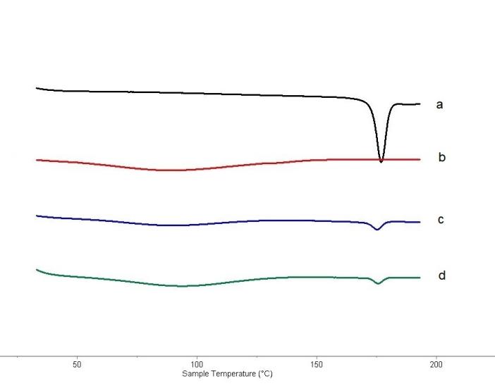 Fig. 3: Differential scanning calorimetry analysis of (a) glibenclamide, (b) hydroxypropyl-β-cyclodextrin, (c) 1:1 mol inclusion complex (d) 1:2 mol inclusion complex