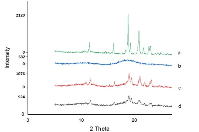 Fig. 4: X-ray diffraction analysis of (a) glibenclamide, (b) hydroxypropyl-β-cyclodextrin, (c) 1:1 mol inclusion complex (d) 1:2 mol inclusion complex