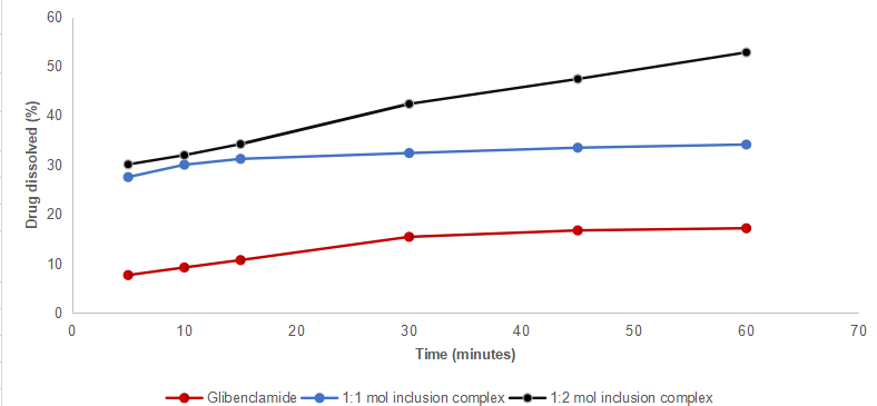 Table 2: Dissolution efficiency of glibenclamide, 1:1 mol inclusion complex, and 1:2 mol inclusion complex in phosphate buffer medium pH 7.4