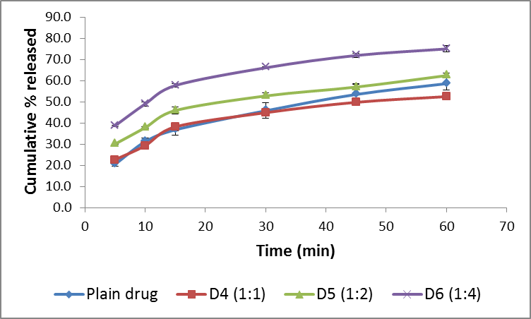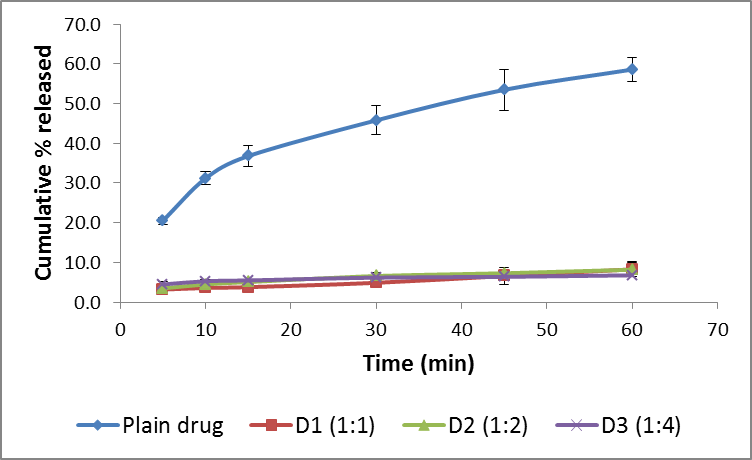 The previous observations could be attributed to the incomplete molecular dispersion of drug in the carrier at the lower ratio leading to the formation of drug aggregates which when comes into contact with the dissolution medium, poloxamer will form a viscous gel layer around the drug slowing down its dissolution, whereas in SDs with a higher poloxamer ratio the drug could be dispersed molecularly among the carrier chain and therefore the formation of the glassy solution type of SD would be easy. When this system comes in contact with the dissolution medium, it will dissolve quickly relative to the wettability, emulsification and solubilisation effects of poloxamer 188 [27, 28].
