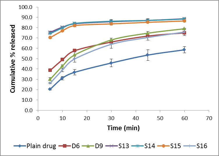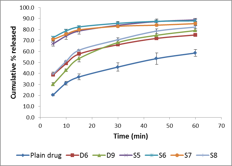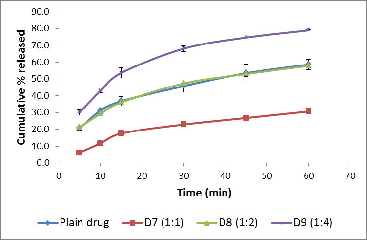 Table 3 shows the average drug content of the prepared SDs and SSDs formulae. The drug content for all preparations ranged from 97.48±0.37% to 102.19±0.49%. Acceptance value (AV) was calculated to determine how far the drug content of the tested preparations varied with respect to the observed average. It was observed that both S6 and S9 showed the lowest AV (0.44), while the highest AV recorded was that of D7. However, all values were found to be within the limit (AV<15) which could be considered satisfactory to indicate a homogenous distribution of the drug in the prepared formulae [18].