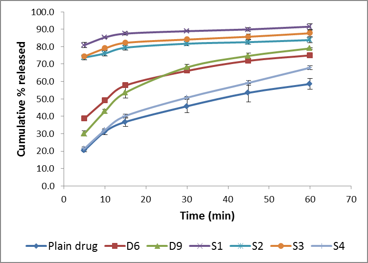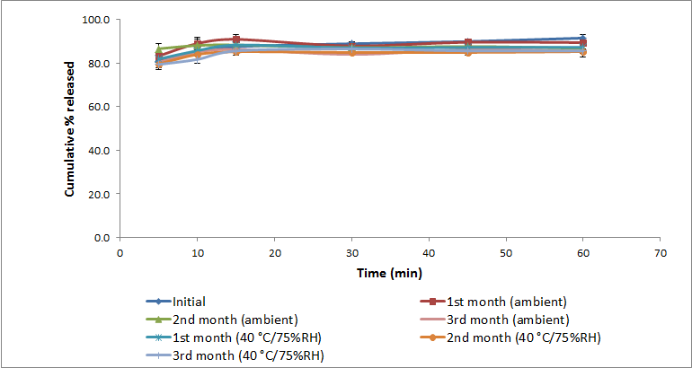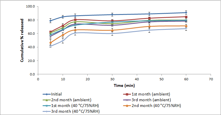 In-vitro drug dissolution of the selected formulae; S1 and S9 was monitored at ambient and accelerated (40 °C/75% RH) conditions for three months.