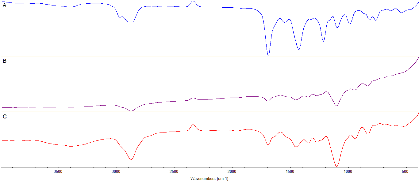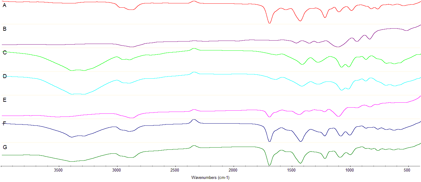 The spectral analysis of plain drug showed many characteristic bands, band at wave number 1700 cm-1 due to the C=O stretching, bands at 1437 cm-1, 1225 cm-1 and 1105 cm-1due to C-O stretching, and bands from 3000 cm-1 to 2880 cm-1 corresponds to C-H stretching [38-40].