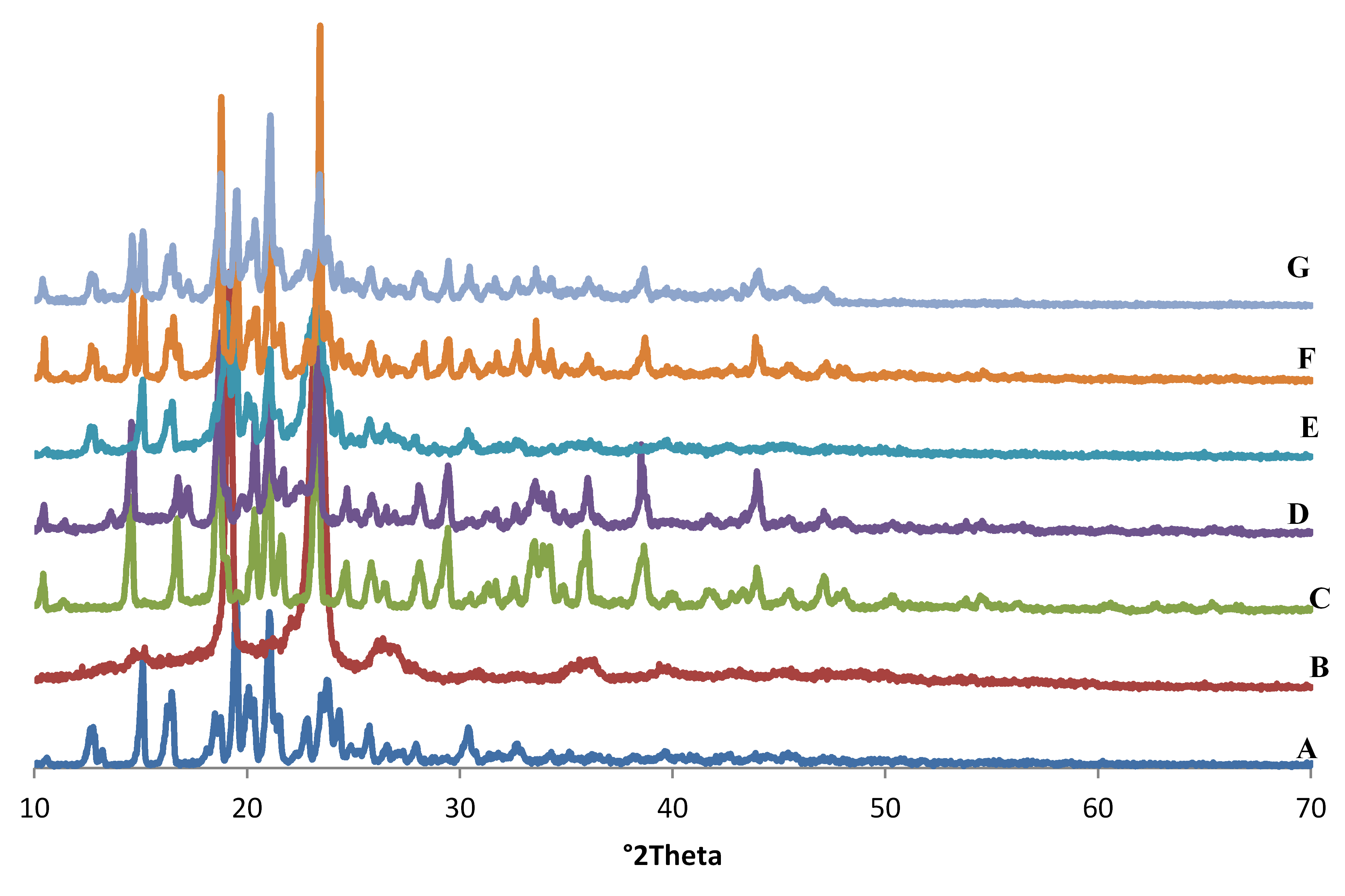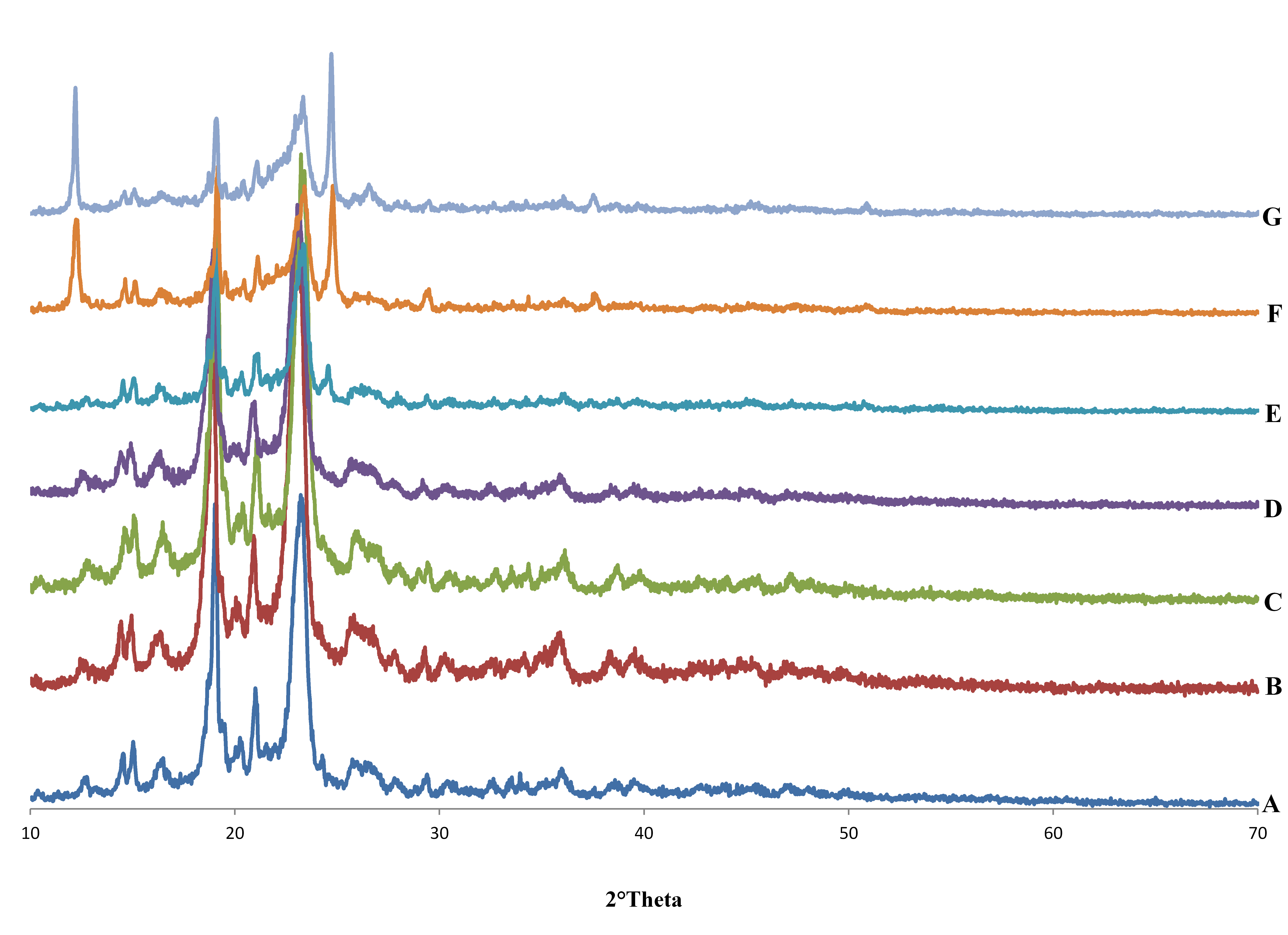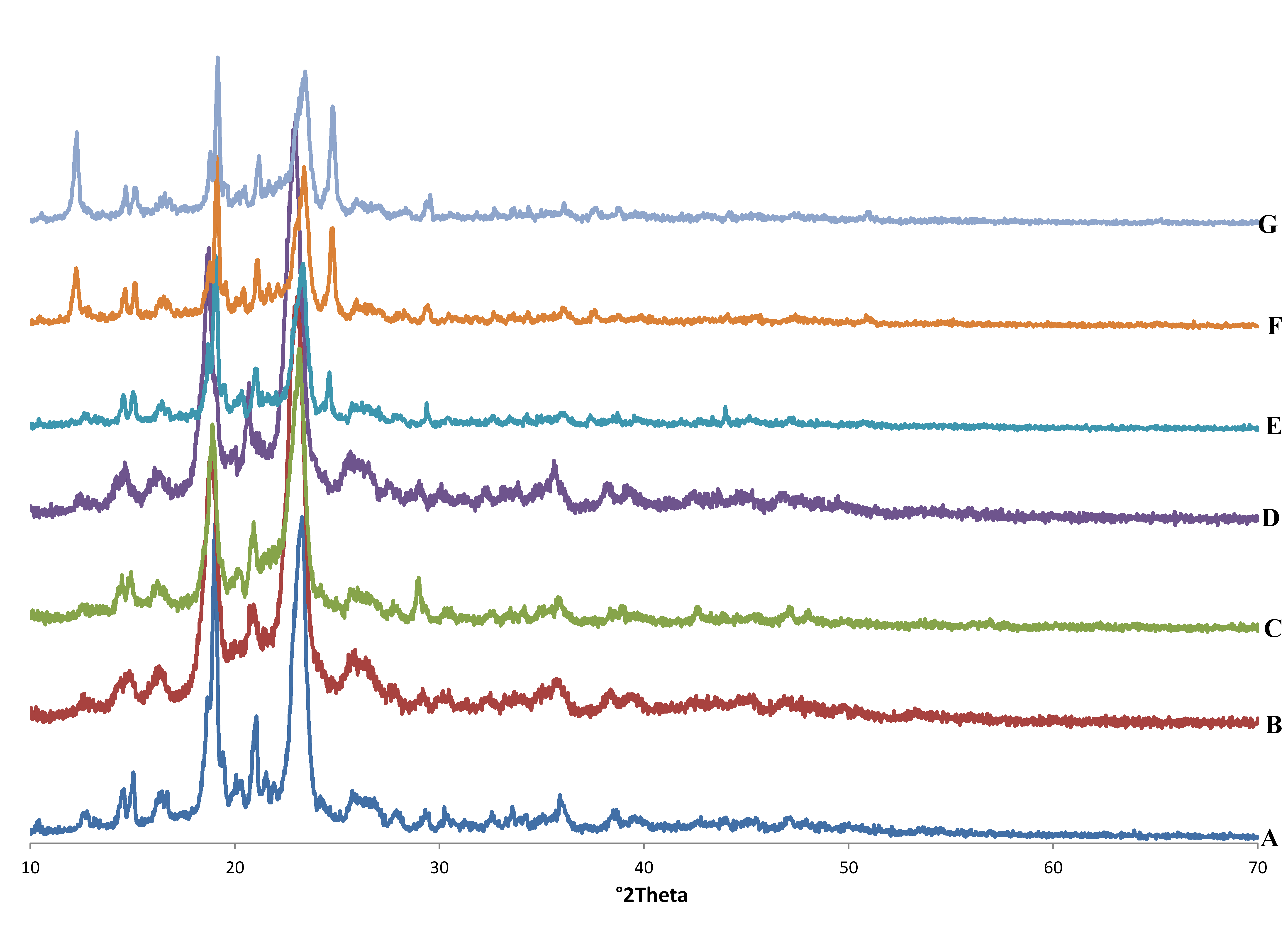 Fig. 16: X-ray diffraction of S1 throughout three months of storage at ambient and accelerated conditions (A) initial, (B) 1st mo (ambient), (C) 2nd mo (ambient), (D) 3rd mo (ambient), (E) 1st mo (accelerated), (F) 2nd mo (accelerated) and (G) 3rd mo (accelerated)