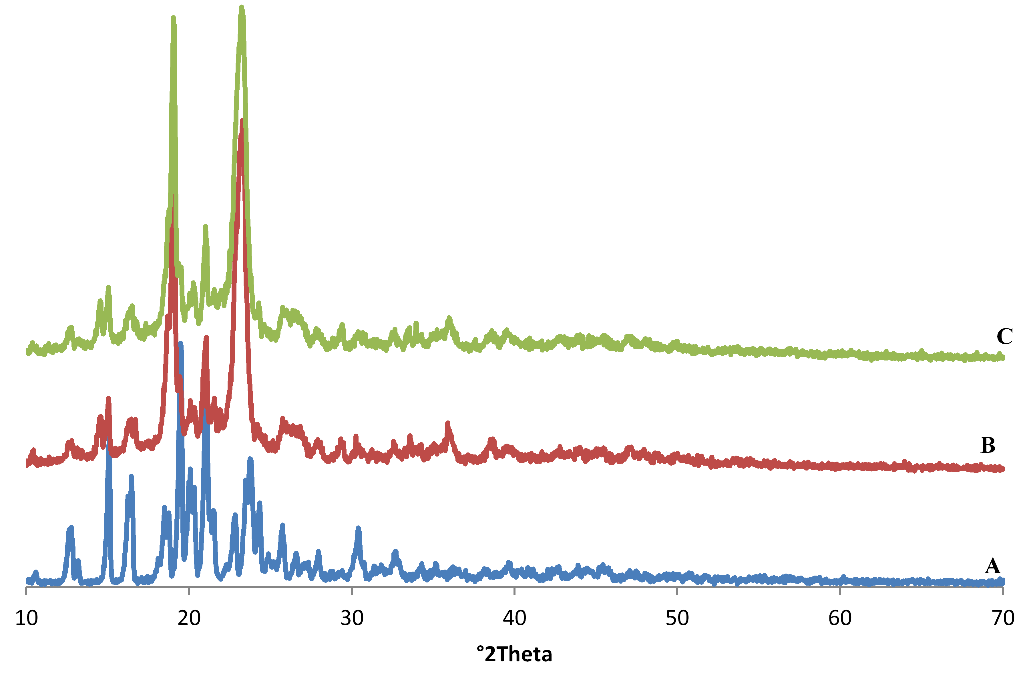 The diffraction pattern of loratadine as shown in fig. 10A shows that the drug has high crystallinity because of the presence of numerous distinct peaks at 2θ diffraction angles. These peaks are located at 12.8, 15.1, 16.4, 19.5, 21.0, 23.7 and 24.3 degrees.