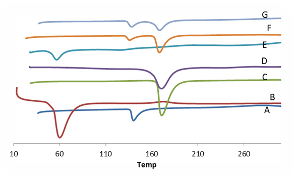 Fig. 12: DSC thermogram of Loratadine (A), Poloxamer 188 (B), Pearlitol flash (C), Prosolv ODT (D), Loratadine+Poloxamer 188 (E), Loratadine+Pearlitol flash (F) and Loratadine+Prosolv ODT (G)