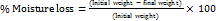Percentage moisture loss was calculated to check the integrity of films in dry condition. Film was cut into 2 cm2 and weighed accurately and kept in desiccators containing fused anhydrous calcium chloride. After 72 h the film was removed and weighed again. The decrease in the weight of the film gave the amount of moisture loss. The % age loss in moisture was calculated by using the following formula [29].