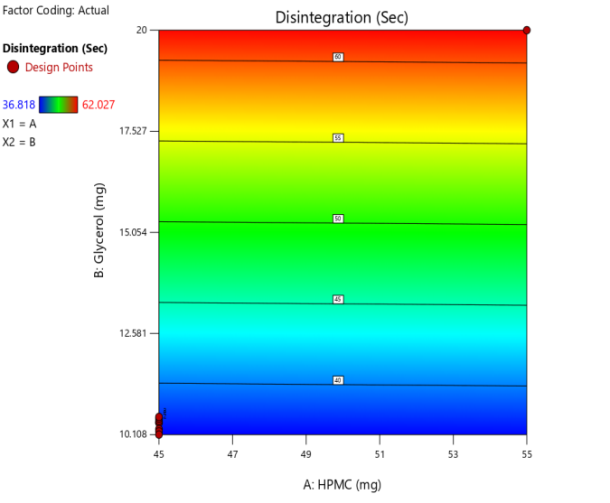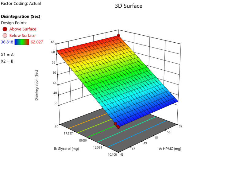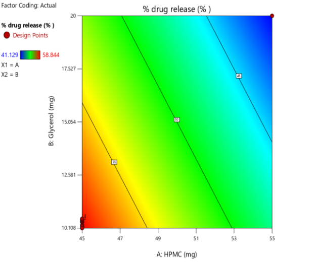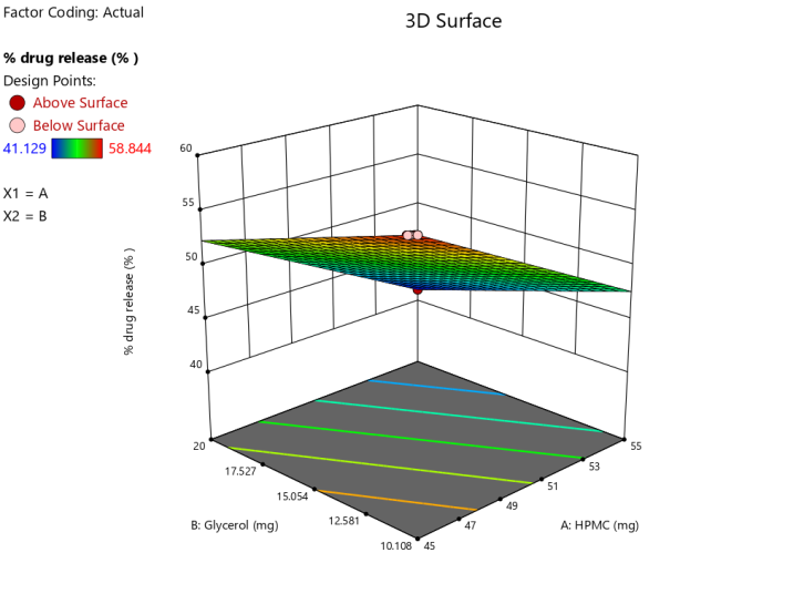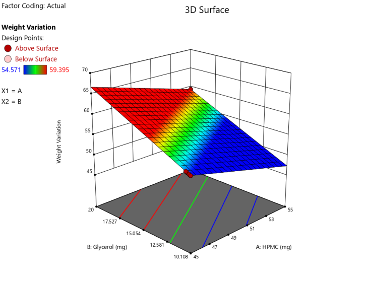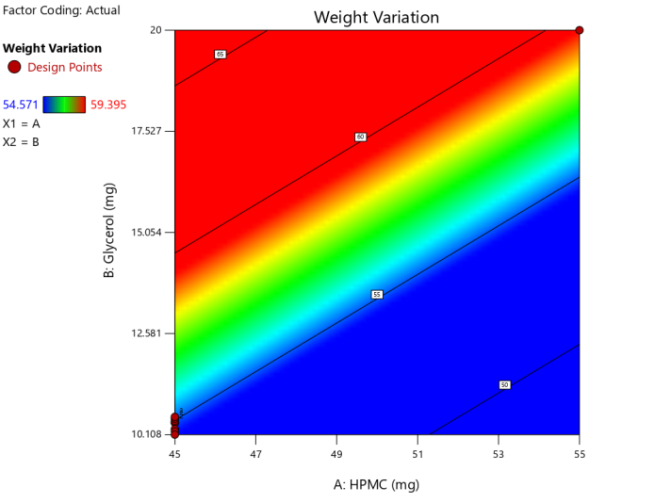 The high levels of the factors are coded as+1 and the low levels of the factors are coded as-1 by default. By comparing the factor coefficients, the coded equation can be used to determine the relative impact of the components. It was discovered from the data that there was a good association between Weight Variation (R2 = 0.9841), It determines whether there is an increase in polymer concentration (when using ANOVA) It exhibits P<0.0001. It could be because of the influence of lower concentration and higher plasticizer concentrations. P-value = 0.0001 was calculated using ANOVA [36].