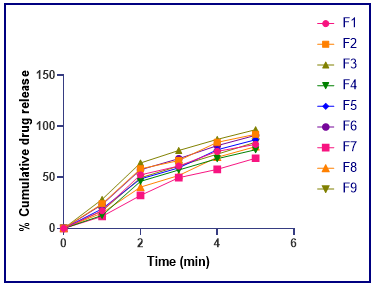 Disintegration time was found to vary between 25 to 35 second film prepared with the HPMC F3 and F6 containing 45% w/w and 50% w/w of polymer concentration had shown fast disintegration as compared to other concentrations. Drug content was evaluated and it varied in the range of 95.954±1.18 to 99.079±1.18. drug content was found to be low for F1 formulation i.e., 93.15±1.05 and more for F3 and F6 formulation i.e., 99.035±1.37 and 99.014±0.79. As per the USP the drug content was found to be in the range of 85-115%.