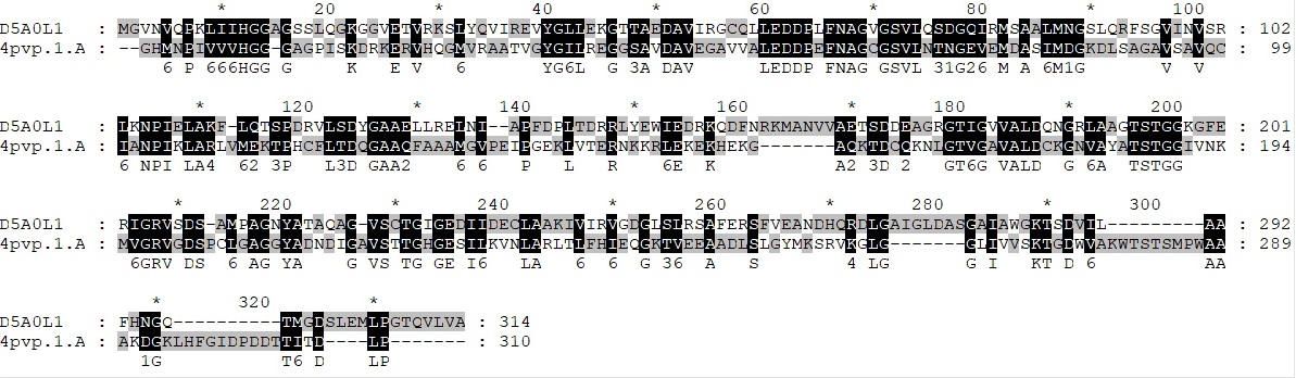 Fig. 2: Sequence alignment between A. platensis D5A0L1 protein and human 4pvp.1. A Isoaspartyl peptidase/l-asparaginase as a template