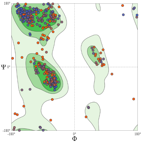 Fig. 3 shows the result of the 3D protein analysis of D5A0L1 using SWISS-MODEL. Based on the outcome, it is confirmed that the model is dominantly α-helix and β-sheet. Also, Ramachandran plots to investigate psi and phi torsion angles were conducted. As a result, the models have a favored Ramachandran of 92.18% (fig. 4.). Ramachandran outliner accounted for 2.89%, including B140 PRO, A14 GLY, A221 ALA, A170 ASP, B116 SER, A266 GLN, A116 SER, A162 ALA, A118 ASP, A155 GLN, A161 MET, B159 ARG, A158 ASN, B166 ALA, B177 THR, B175 ARG, A175 ARG.