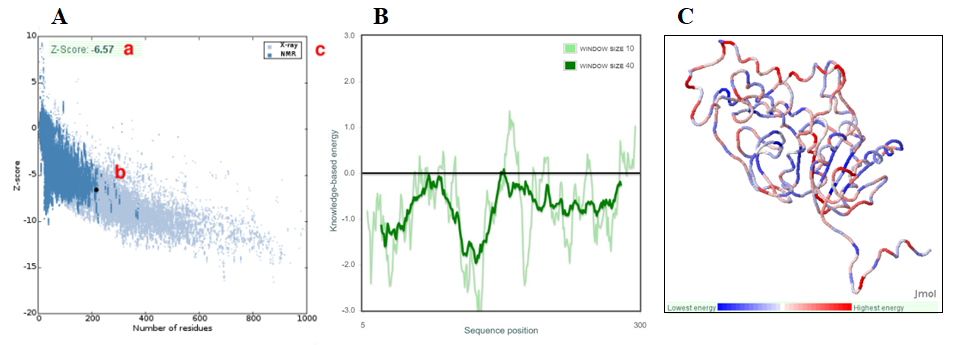 Fig. 5: Result of the PROSA web analysis. A. plot of Z-score, B. residue scores of a native protein structure, and C. visualization of molecules