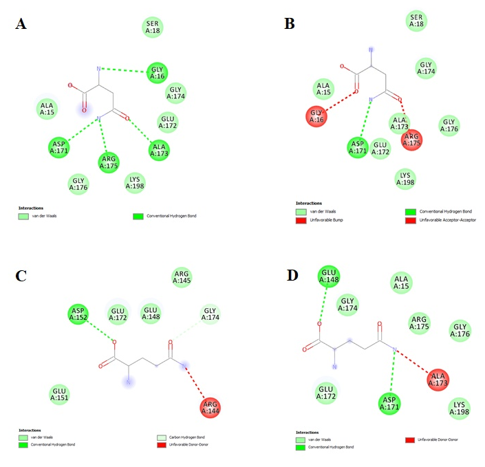 Fig. 7: Binding pocked L-asparaginase with amino acids. L-asparagine (A), D-asparagine (B), L-glutamine (C), D-glutamine (D)