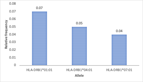 Fig. 8: Relative frequency of predicted immunogenic T-cell epitopes in A. platensis-ANSase for three alleles (HLA-DRB1*01:01, HLA-DRB1*04:01, HLA-DRB1*015:01)