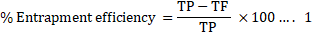 Where, TP is the total amount of drug, TF amount of drug in supernatant