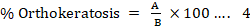 The processed skin samples were examined microscopically for the presence of granular layer in the scale regions and also for epidermal thickness. Induction of orthokeratosis in those parts of the adult rat tail, having normal parakeratotic differentiation was quantified by measuring the length of the granular layer (A) and the length of the scale (B). Ten sequential scales were examined for each skin section. Percent orthokeratosis was calculated by using equation 4 and Drug activity (DA) was calculated using 5.